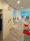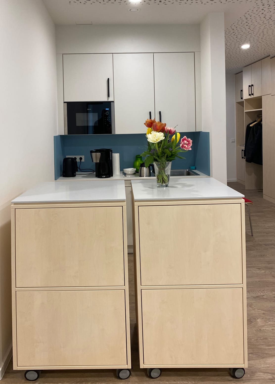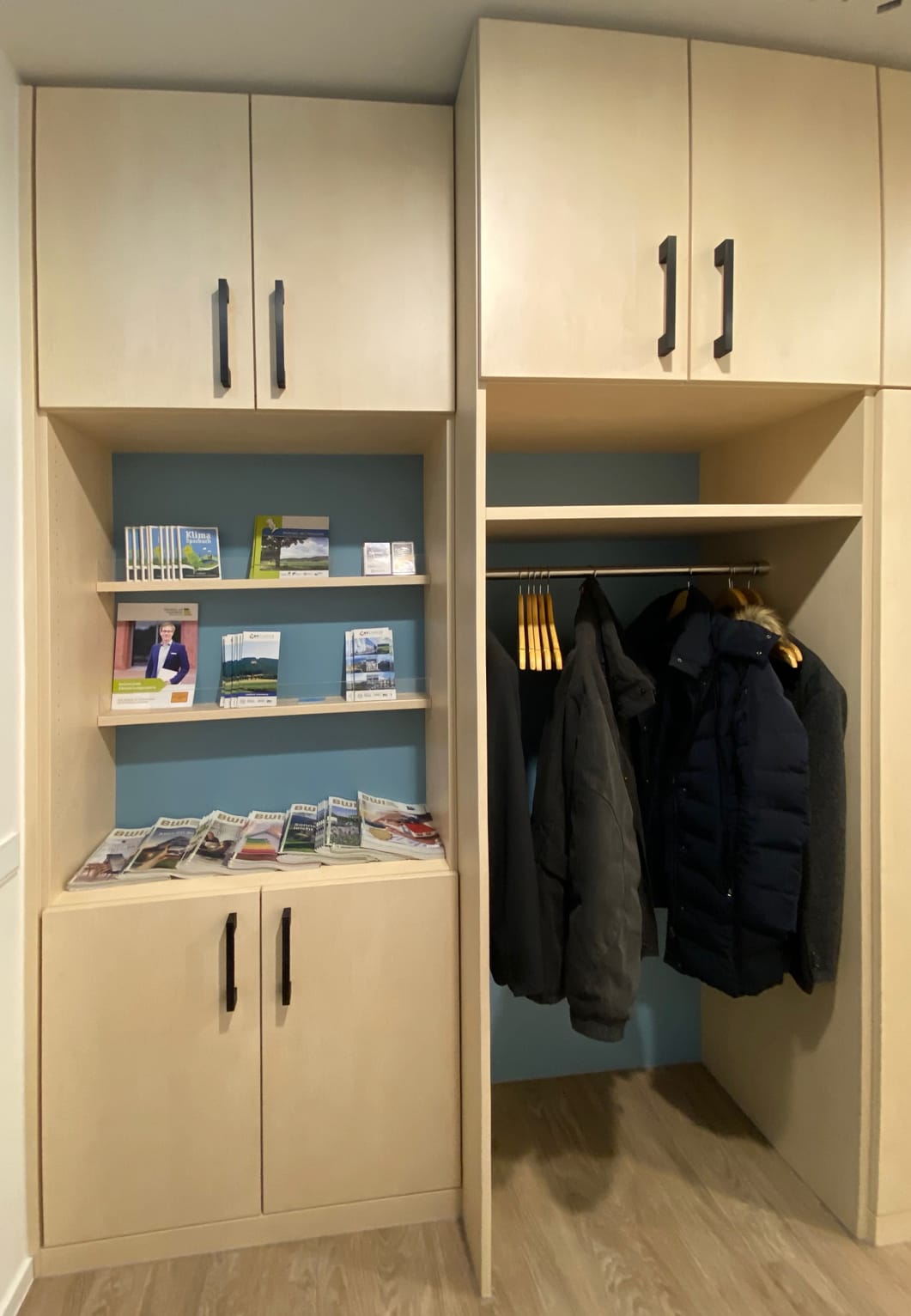 Planung und Einrichtung der Bürofläche der Energieagentur Stadthagen Büroräume für sechs Mitarbeiter und Mitarbeiterinnen mit multifunktionalen Eingangsbereich aus Empfang, Teeküche und bei Bedarf abtrennbaren Besprechungsraum.