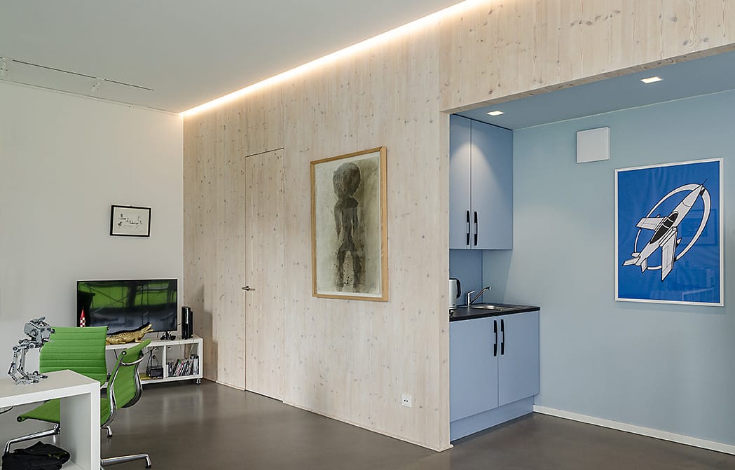 Das Ziel war es, ein Gebäude zu entwerfen, das zunächst als Büroatelier und später als kleines Wohnhaus genutzt werden kann. Eine Wand aus Fichtenholz-Dreischichtplatten trennt den großen, hohen Hauptraum von den Funktionsräumen wie Badezimmer, Küche, Eingang und Abstellbereich. Großzügige Hebeschiebefenster öffnen sich zur überdachten Holzterrasse. Die äußere Holzverkleidung wurde mit einem natürlichen Holzschutz behandelt, der im Laufe der Zeit dem Holz einen Treibholzlook verleiht.