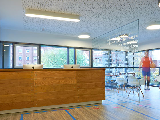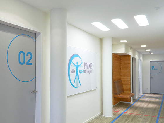 Eine Büroetage der Calenberger Esplanade wurde in eine orthopädische Gemeinschaftspraxis umgewandelt. Angesichts des medizinischen Schwerpunkts der Ärzte, die sich auf die Betreuung von Sportlern spezialisiert haben, wurden verschiedene Motive aus Turnhallen in das Design der Räumlichkeiten integriert. Durch Spielfeldmarkierungen auf dem Fußboden und umgebaute Turngeräte entstand ein unverwechselbares Erscheinungsbild.