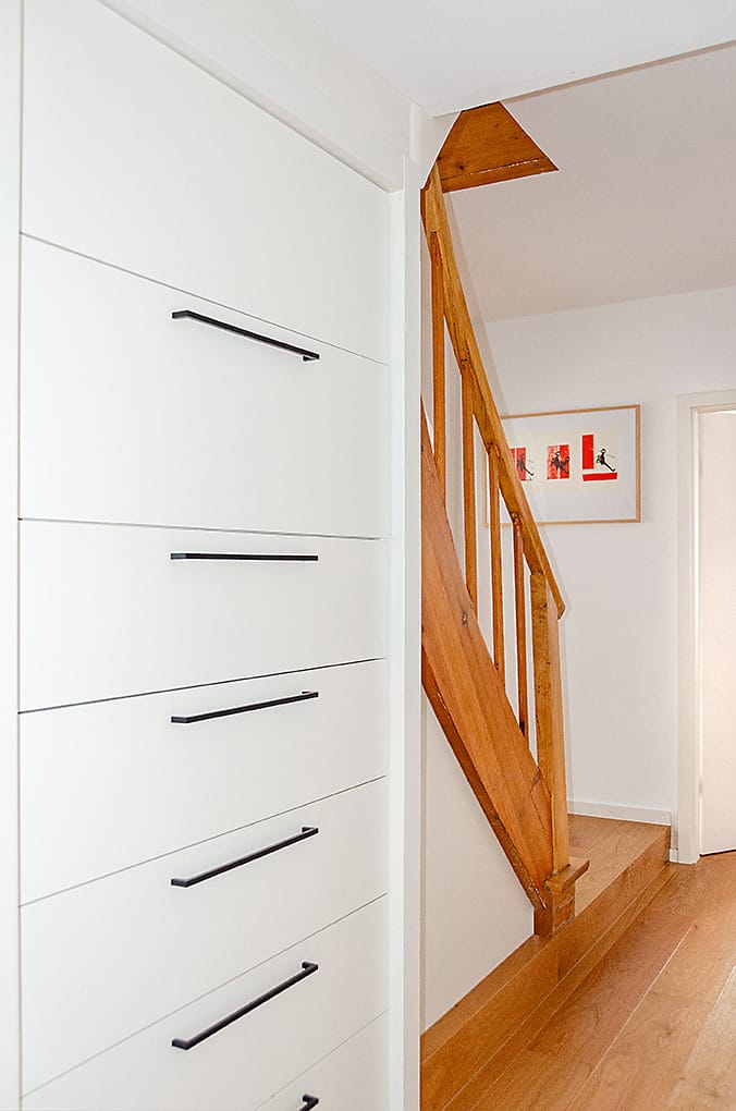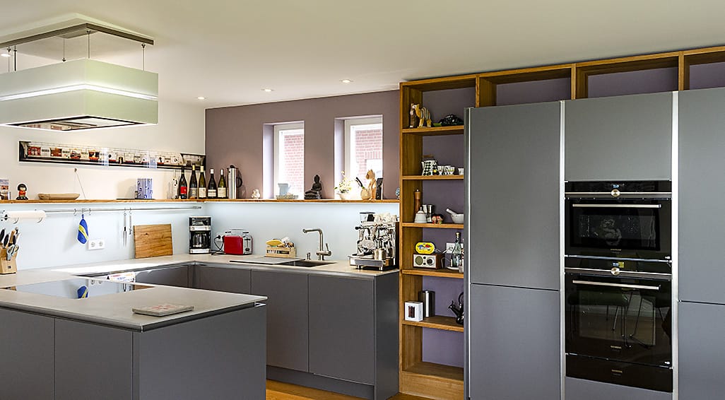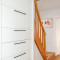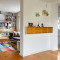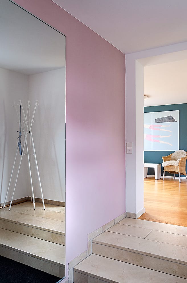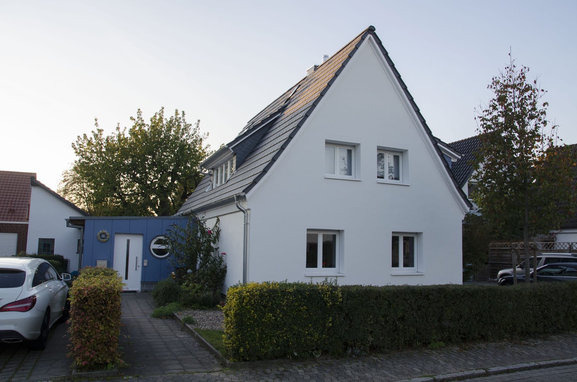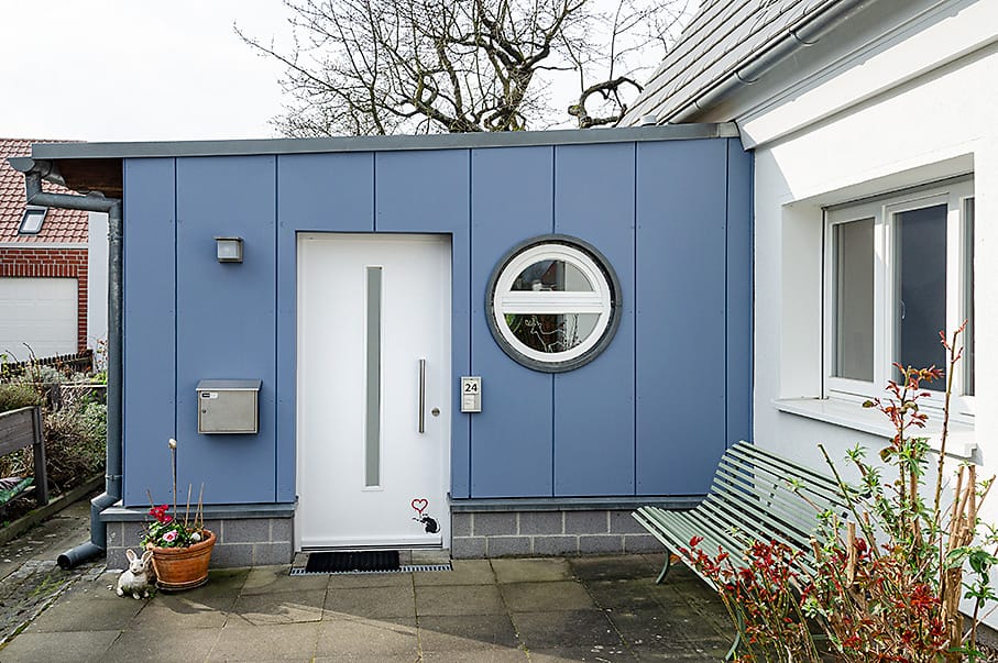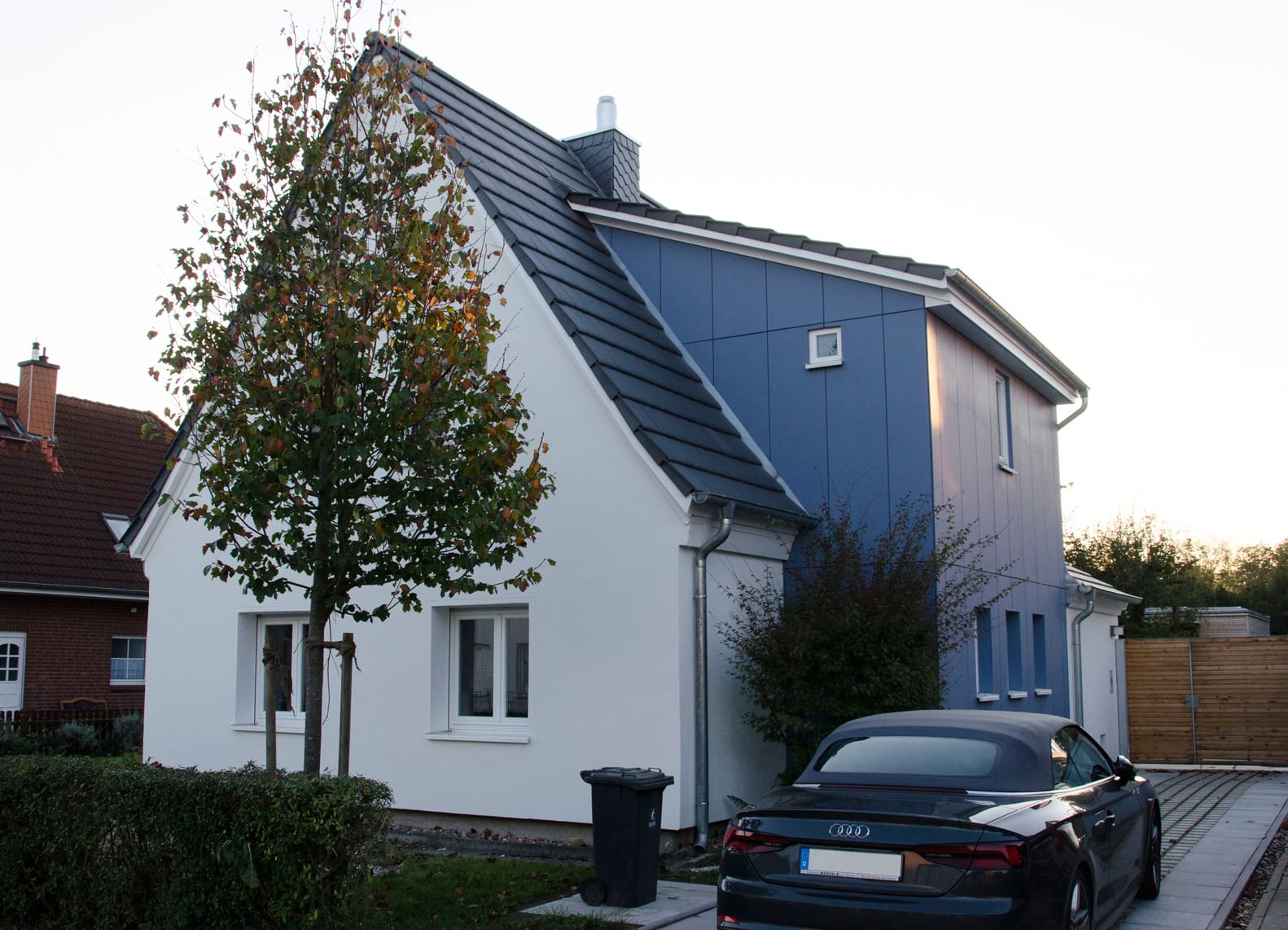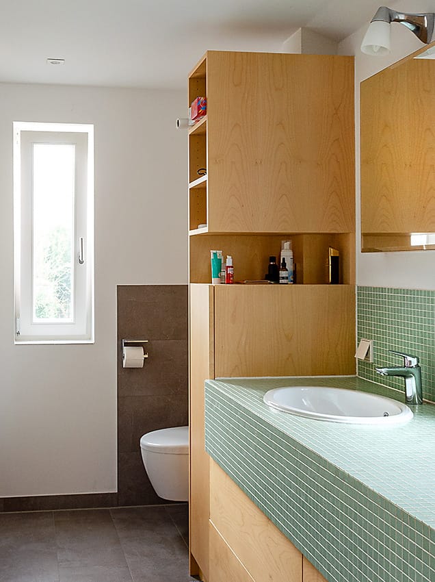 Die Räumlichkeiten im Erdgeschoss und Obergeschoss wurden neu geordnet und umgestaltet. Das ehemalige Wohnzimmer wurde zu einer großzügigen Küche mit Essbereich umgewandelt, die zum Garten hin ausgerichtet ist. Aus der Küche entstand eine Loungezone mit einem Grundofen. Die neuen Sichtachsen verleihen den Räumen eine offene Atmosphäre mit besonderen Farbakzenten. Im Rahmen dieser Neugestaltung wurde auch die Gebäudehülle saniert. Das Dach wurde neu eingedeckt und mit einer Aufsparrendämmung versehen, und die Fassade erhielt einen neuen Anstrich. Zudem wurden Teile des Außenbereichs an das neue Gestaltungskonzept angepasst.