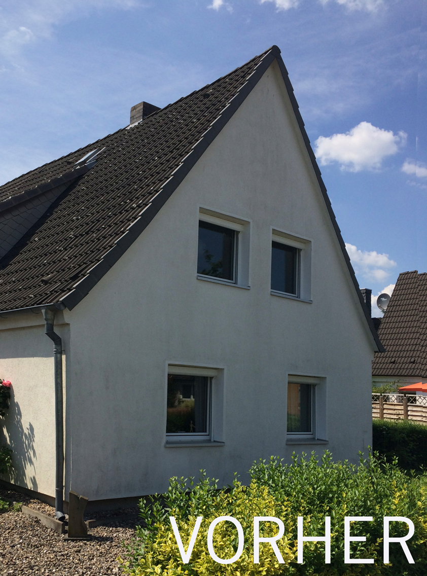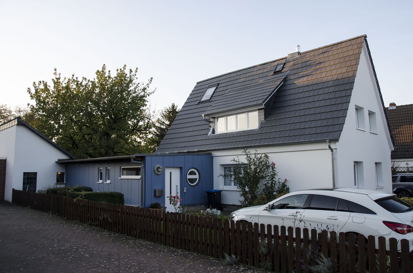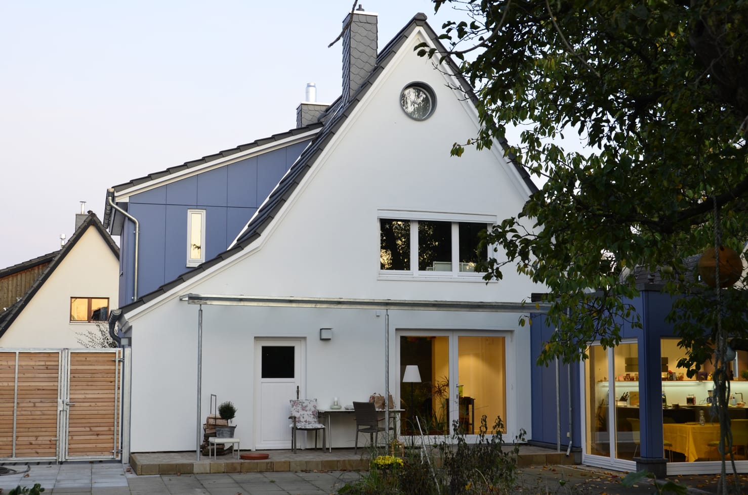 Die Räumlichkeiten im Erdgeschoss und Obergeschoss wurden neu geordnet und umgestaltet. Das ehemalige Wohnzimmer wurde zu einer großzügigen Küche mit Essbereich umgewandelt, die zum Garten hin ausgerichtet ist. Aus der Küche entstand eine Loungezone mit einem Grundofen. Die neuen Sichtachsen verleihen den Räumen eine offene Atmosphäre mit besonderen Farbakzenten. Im Rahmen dieser Neugestaltung wurde auch die Gebäudehülle saniert. Das Dach wurde neu eingedeckt und mit einer Aufsparrendämmung versehen, und die Fassade erhielt einen neuen Anstrich. Zudem wurden Teile des Außenbereichs an das neue Gestaltungskonzept angepasst.