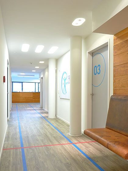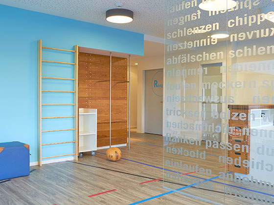 Eine Büroetage der Calenberger Esplanade wurde in eine orthopädische Gemeinschaftspraxis umgewandelt. Angesichts des medizinischen Schwerpunkts der Ärzte, die sich auf die Betreuung von Sportlern spezialisiert haben, wurden verschiedene Motive aus Turnhallen in das Design der Räumlichkeiten integriert. Durch Spielfeldmarkierungen auf dem Fußboden und umgebaute Turngeräte entstand ein unverwechselbares Erscheinungsbild.