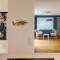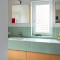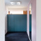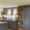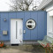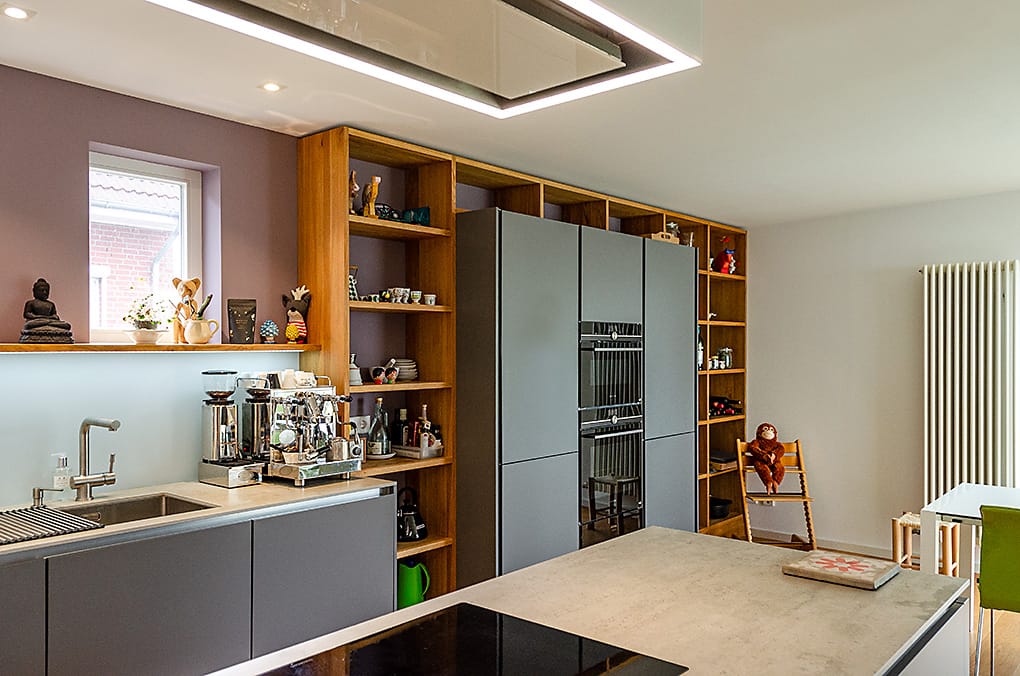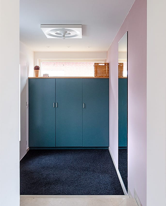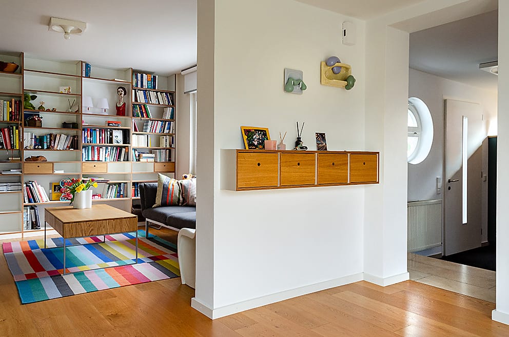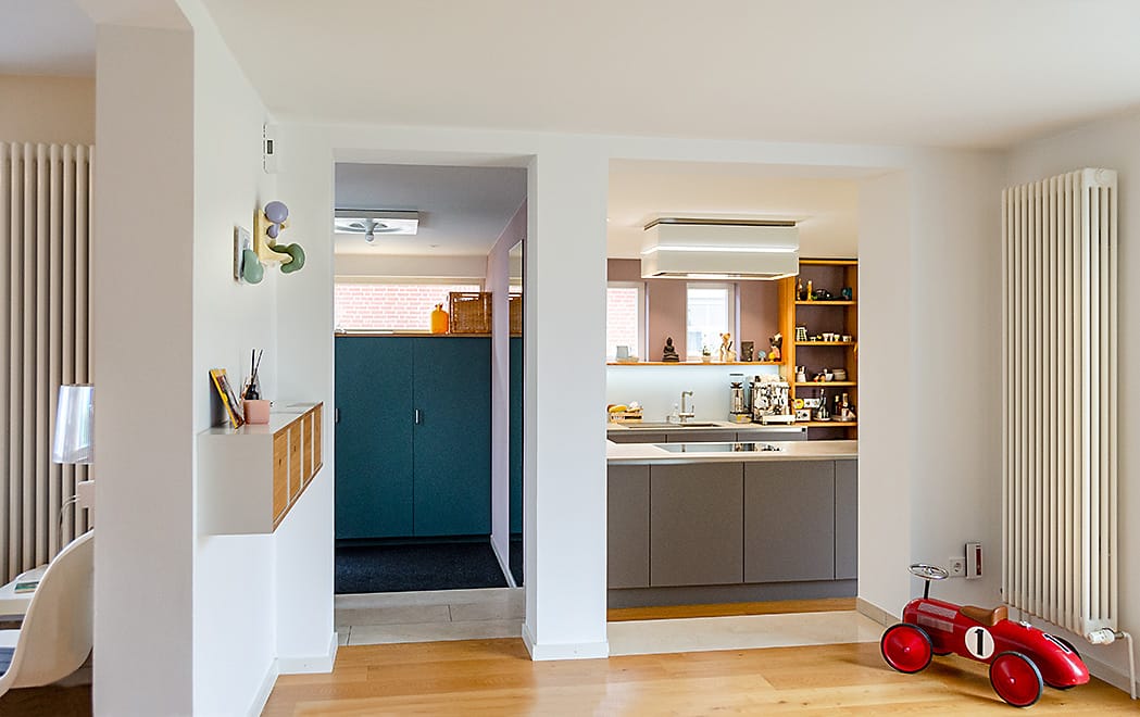 Die Räumlichkeiten im Erdgeschoss und Obergeschoss wurden neu geordnet und umgestaltet. Das ehemalige Wohnzimmer wurde zu einer großzügigen Küche mit Essbereich umgewandelt, die zum Garten hin ausgerichtet ist. Aus der Küche entstand eine Loungezone mit einem Grundofen. Die neuen Sichtachsen verleihen den Räumen eine offene Atmosphäre mit besonderen Farbakzenten. Im Rahmen dieser Neugestaltung wurde auch die Gebäudehülle saniert. Das Dach wurde neu eingedeckt und mit einer Aufsparrendämmung versehen, und die Fassade erhielt einen neuen Anstrich. Zudem wurden Teile des Außenbereichs an das neue Gestaltungskonzept angepasst.
